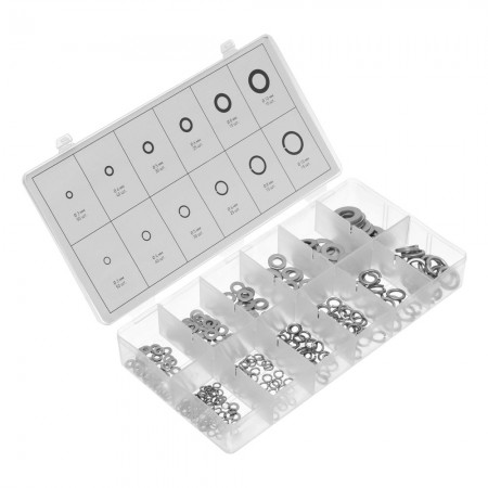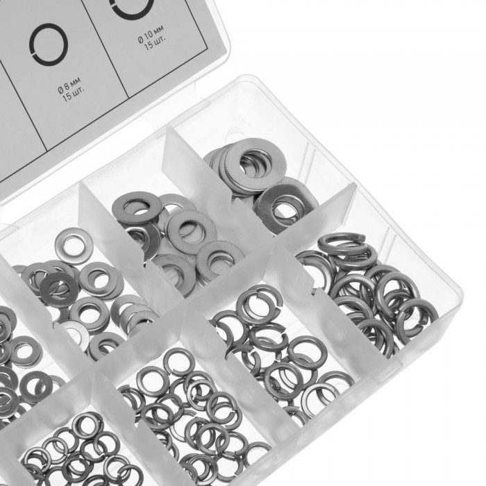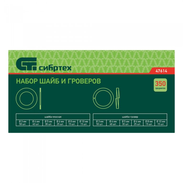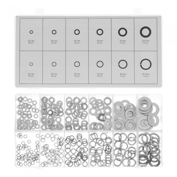 Набор шайб и гроверов, D шайб: 3, 4, 5, 6, 8, 10 мм D гроверов: 3, 4, 5, 6, 8, 10 мм, 350 предметов Сибртех (47614)