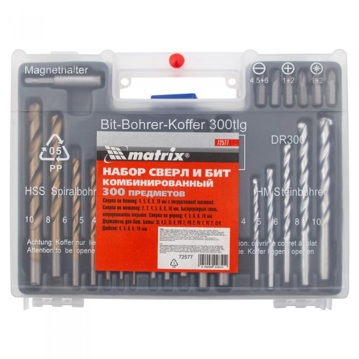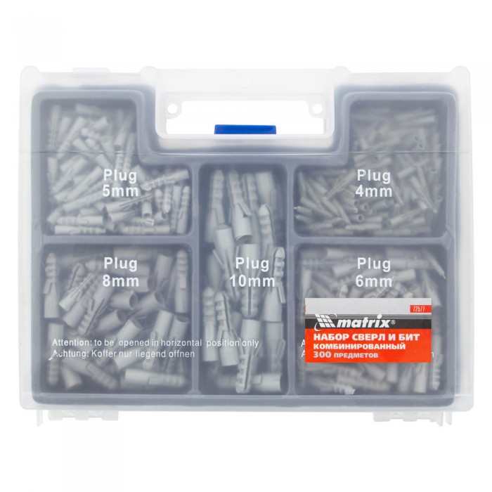 Набор сверл комбинированный: бетон 4-10 мм, металл 2-10 мм, дерево 4-10 мм, дюбеля, 300 предметов Matrix (72577)
