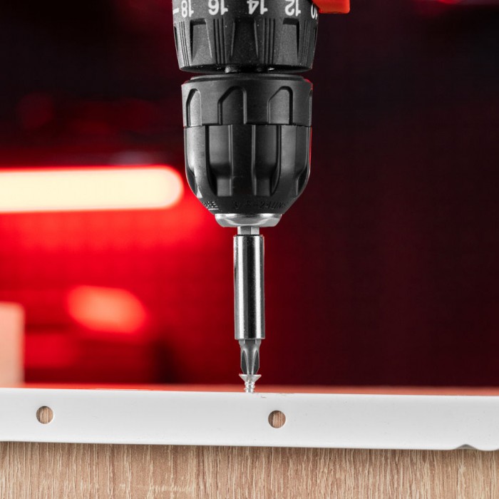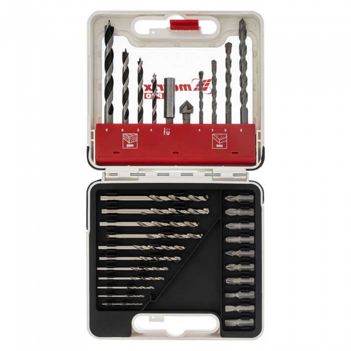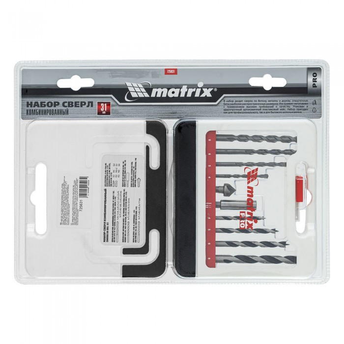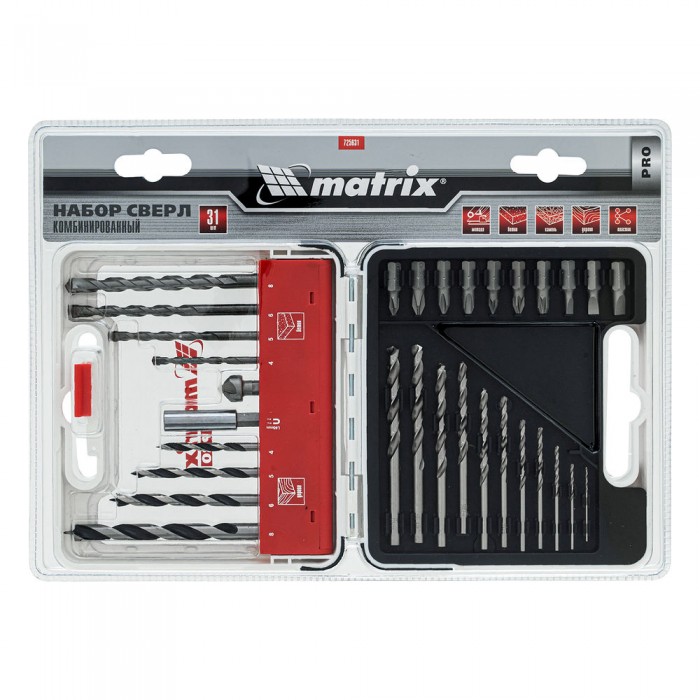 Набор сверл комбинированный, сверла по металлу 1-6 мм, бетону 4-8 мм, дереву 4-8 мм, биты 10 шт, адаптер, зенковка, 31 предмет Pro Matrix (725631)