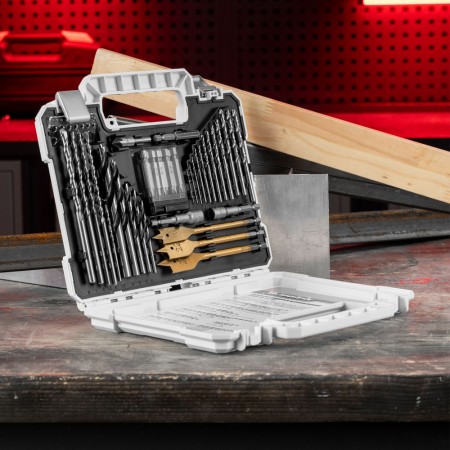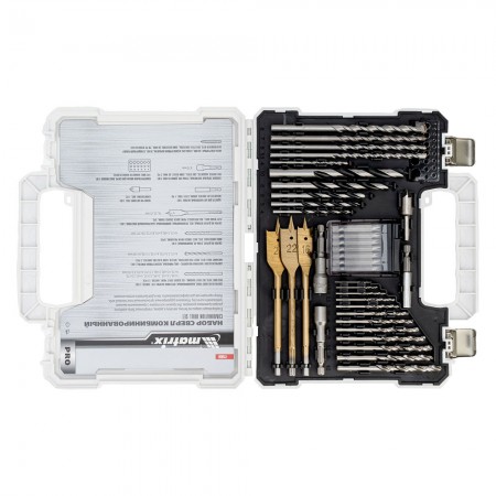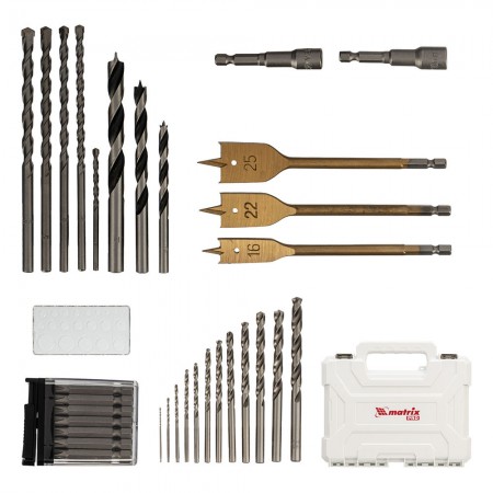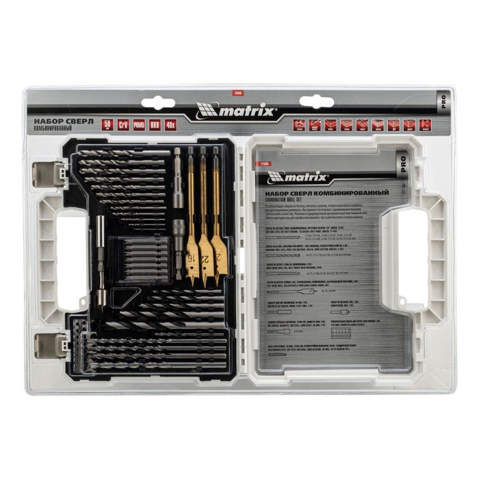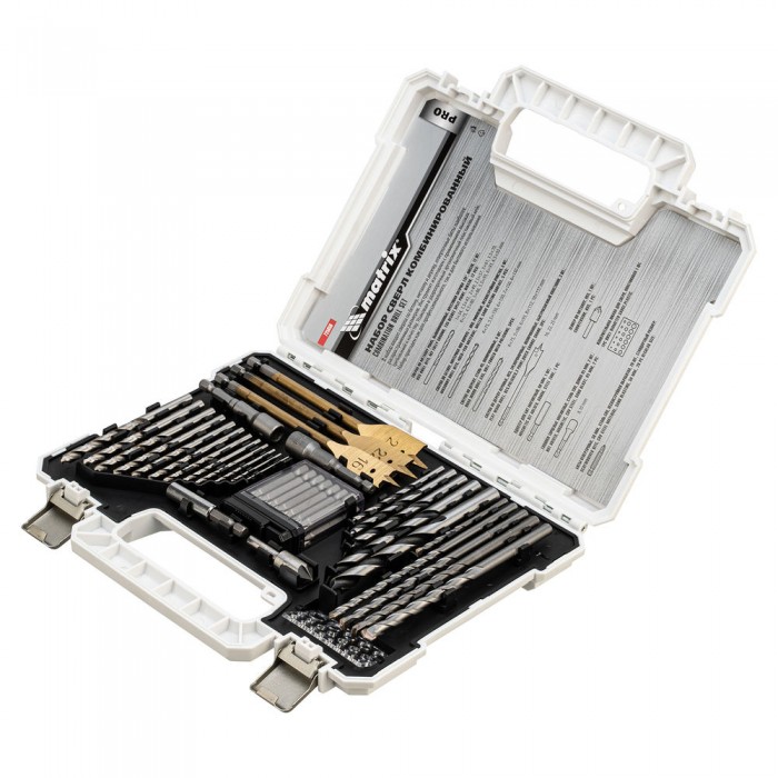 Набор сверл комбинированный, сверла по металлу 1-6.5 мм, бетону 4-8 мм, дереву 4-10 мм, перовые 16,22,25 мм, биты 20 шт, адаптер, головки 2 шт, зенковка, 50 предметов Pro Matrix (725650)