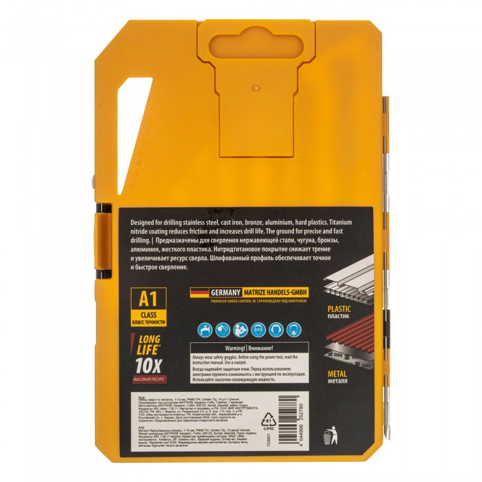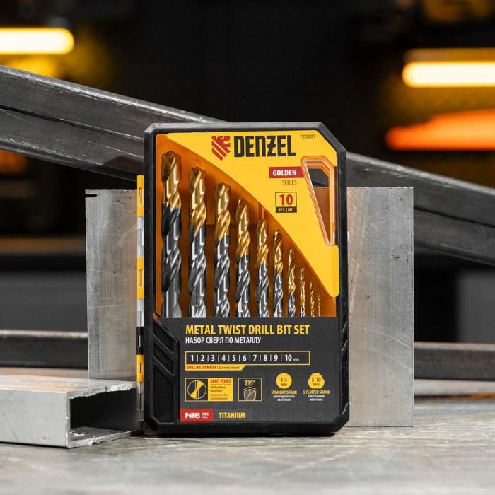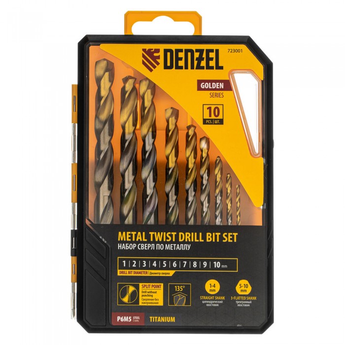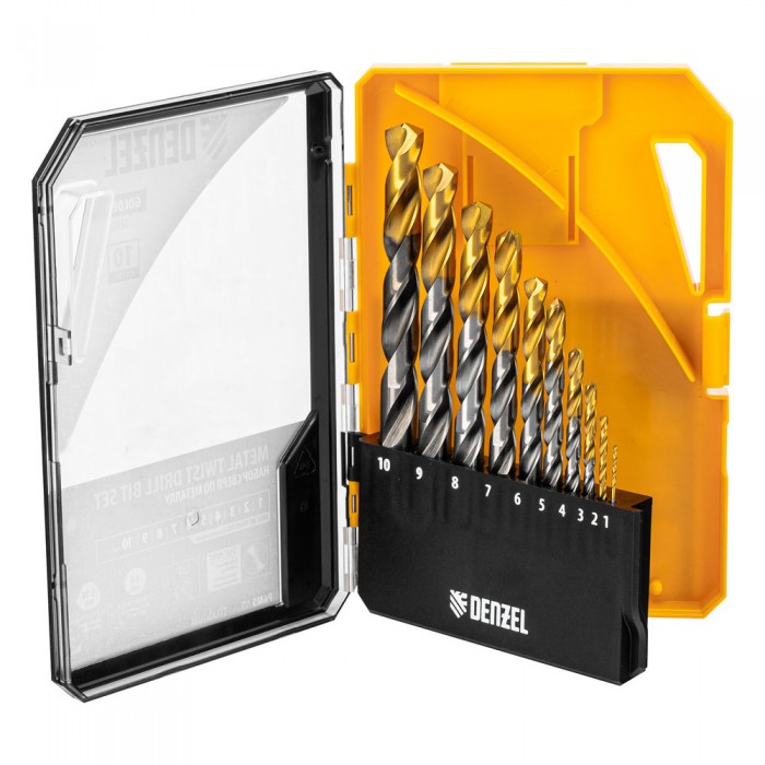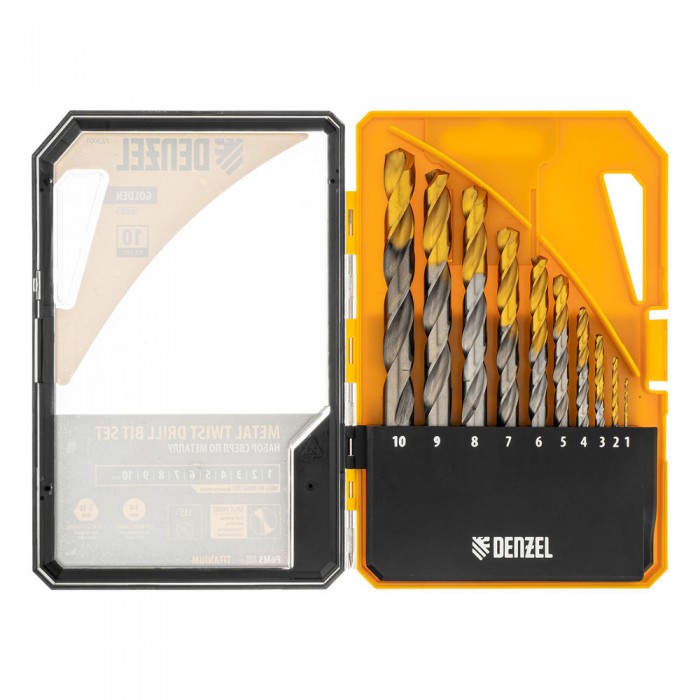 Набор сверл по металлу, 1-10 мм, Р6М5-TiN, Golden Tip, 10 шт Denzel (723001)