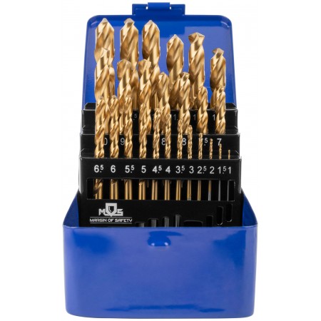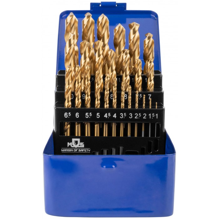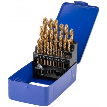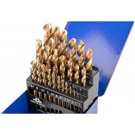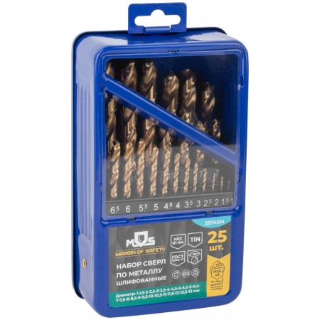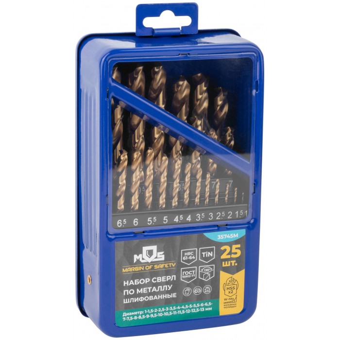Набор сверл по металлу HSS шлифованные, титановое покрытие, угол заточки 135°, мет.бокс, 25 шт. (1-13 мм, через 0,5 мм) (35745М)