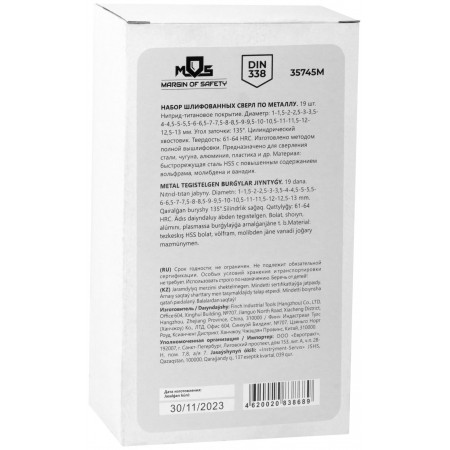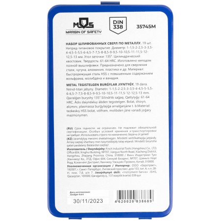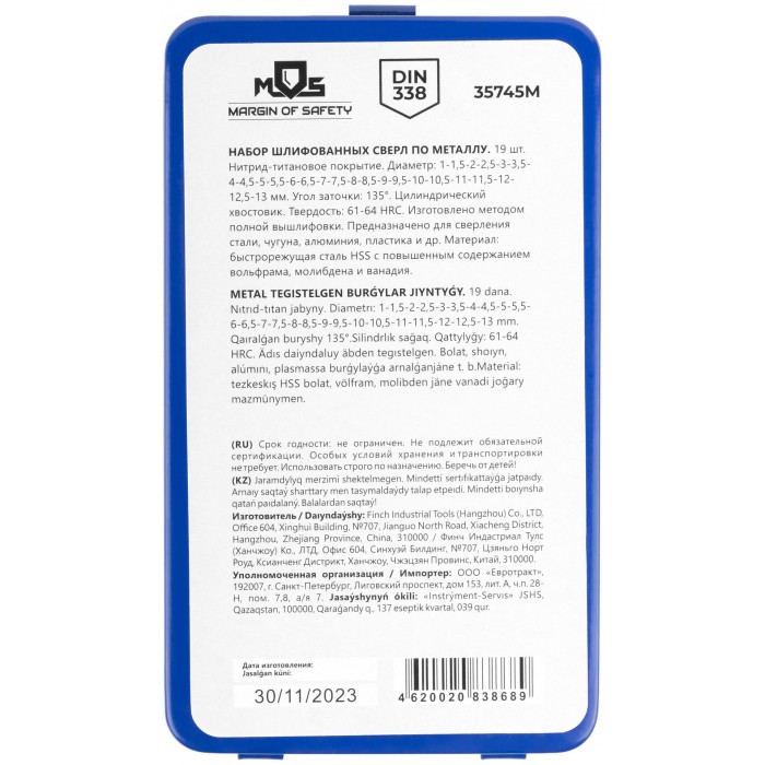 DIN338. Цилиндрический хвостовик. Изготовленно методом полной вышлифовки. Угол заточки 135°. Твердость: 61-64HRC. Материал: быстрорежущая сталь с повышенным содержанием вольфрама, молибдена и ванадия. Титановое покрытие. Упаковка: металлическая коробка.