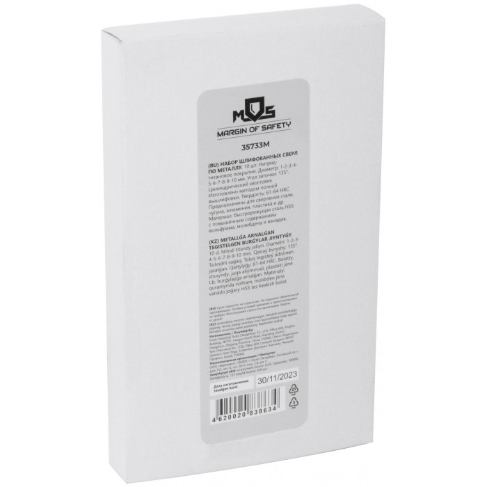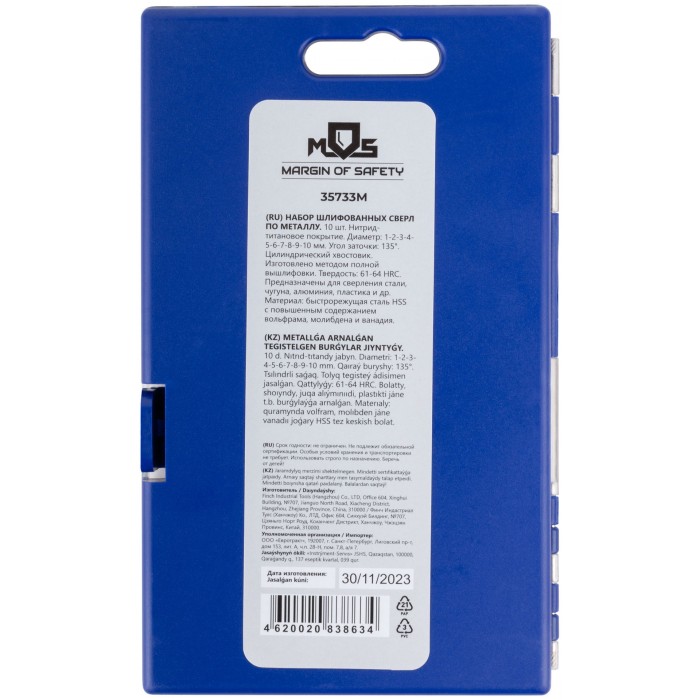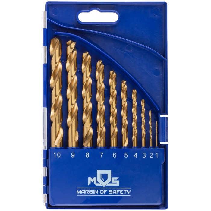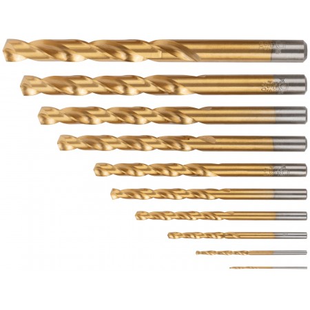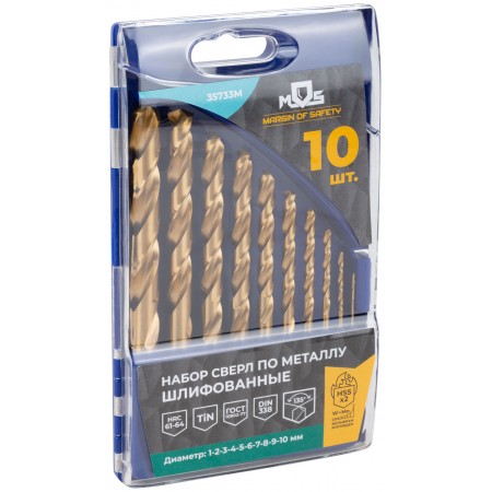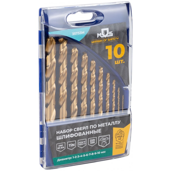 Набор сверл по металлу HSS шлифованные, титановое покрытие, угол заточки 135°, пласт. кейс, 10 шт. (1-2-3-4-5-6-7-8-9-10 мм) (35733М)