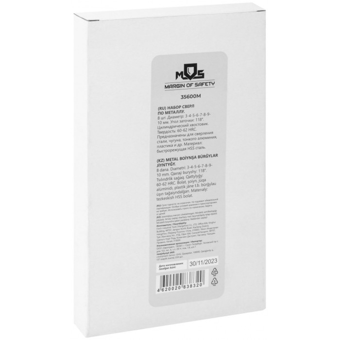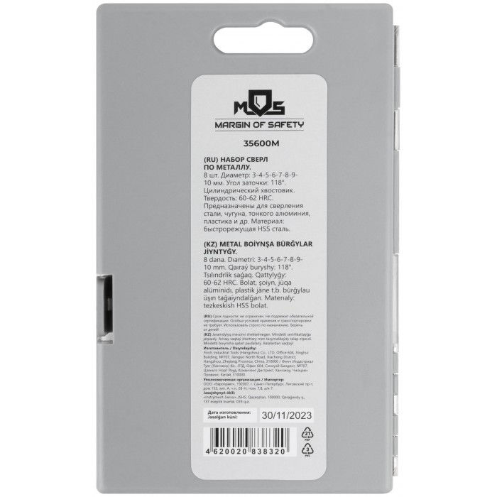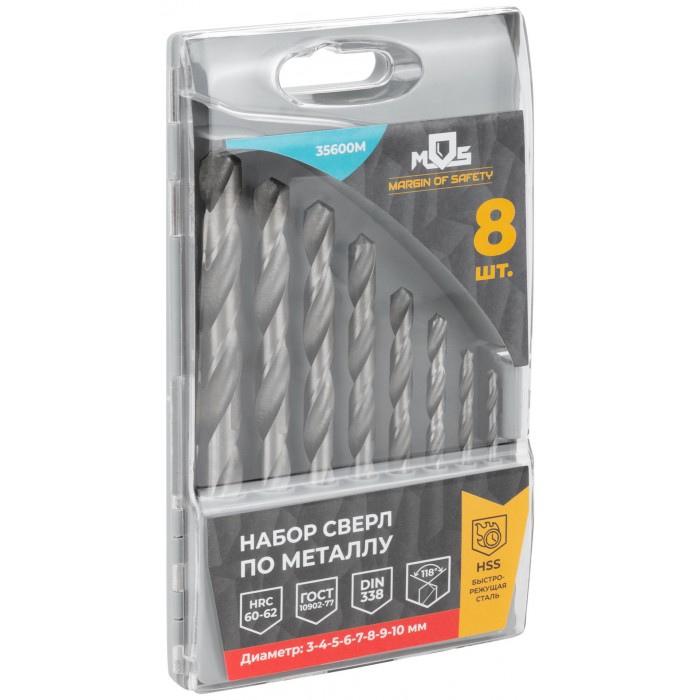 Набор сверл по металлу HSS, угол заточки 118°, пласт. кейс, 8 шт. (3-4-5-6-7-8-9-10мм) (35600М)