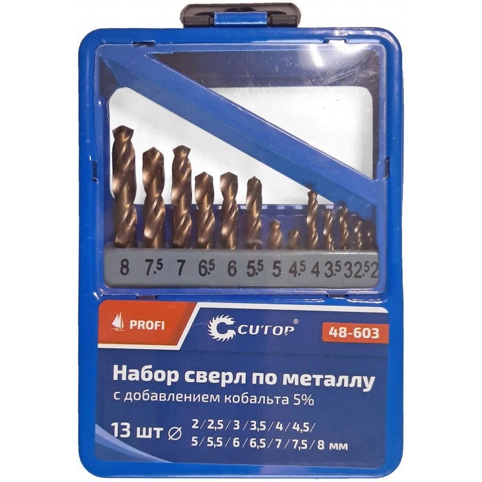 Набор сверл по металлу с кобальтом 5% в металлической коробке; 2-8 мм (через 0,5 мм), 13 шт., Cutop Profi (48-603)
