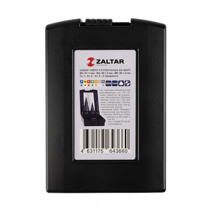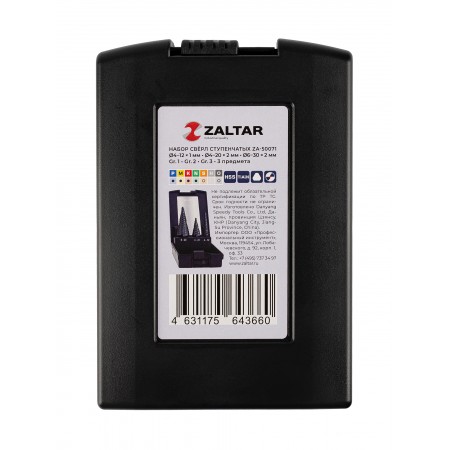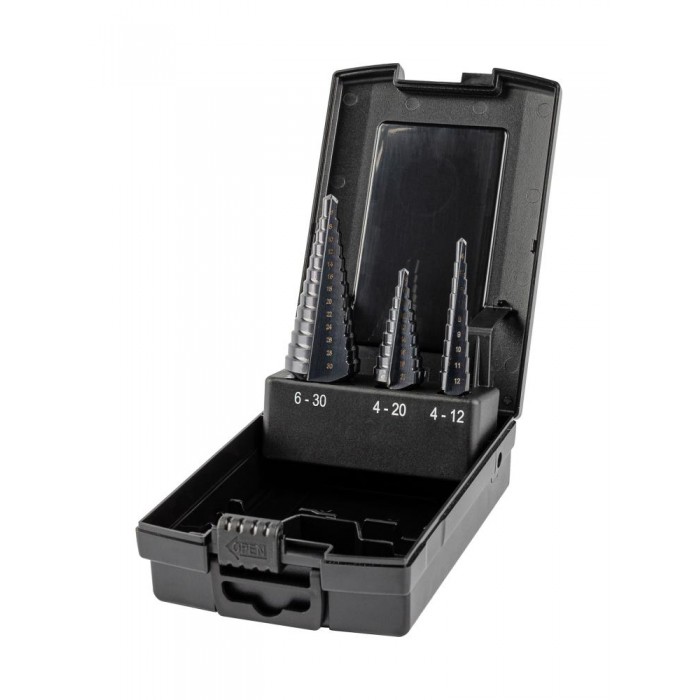 Набор свёрл ступенчатых, 3 пр., HSS TiAlN, Gr.1/2/3, O4-12, 4-20, 6-30 мм, прямая канавка, трёхплоскостной хвостовик (ZA-50071)