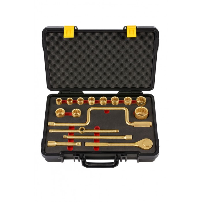 Набор торцевых головок искробезопасных №101 HORTZ. Торцевая искробезопасная головка предназначена для выполнения слесарно-монтажных работ в потенциально взрывоопасных зонах. Изготавливается в двух вариантах сплавов: алюминиевая бронза и бериллиевая бронза (AL-Cu & Be-Cu). Торцевые головки обладают высокой прочностью и точностью исполнения, что обеспечивает надёжный захват болтов и гаек. Инструменты из состава алюминиевая бронза и бериллиевая бронза подходят для использования в более сложных и опасных средах, где уровня защиты омедненных инструментов недостаточно для проведения работ. Сертифицирован в соответствии со стандартами взрывобезопасности ТР ТС 012/2011.
