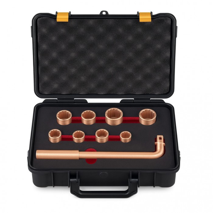 Набор торцевых головок искробезопасных №101 HORTZ. Торцевая искробезопасная головка предназначена для выполнения слесарно-монтажных работ в потенциально взрывоопасных зонах. Изготавливается в двух вариантах сплавов: алюминиевая бронза и бериллиевая бронза (AL-Cu & Be-Cu). Торцевые головки обладают высокой прочностью и точностью исполнения, что обеспечивает надёжный захват болтов и гаек. Инструменты из состава алюминиевая бронза и бериллиевая бронза подходят для использования в более сложных и опасных средах, где уровня защиты омедненных инструментов недостаточно для проведения работ. Сертифицирован в соответствии со стандартами взрывобезопасности ТР ТС 012/2011.