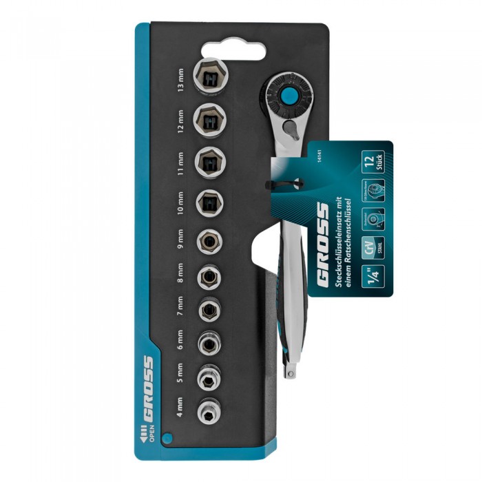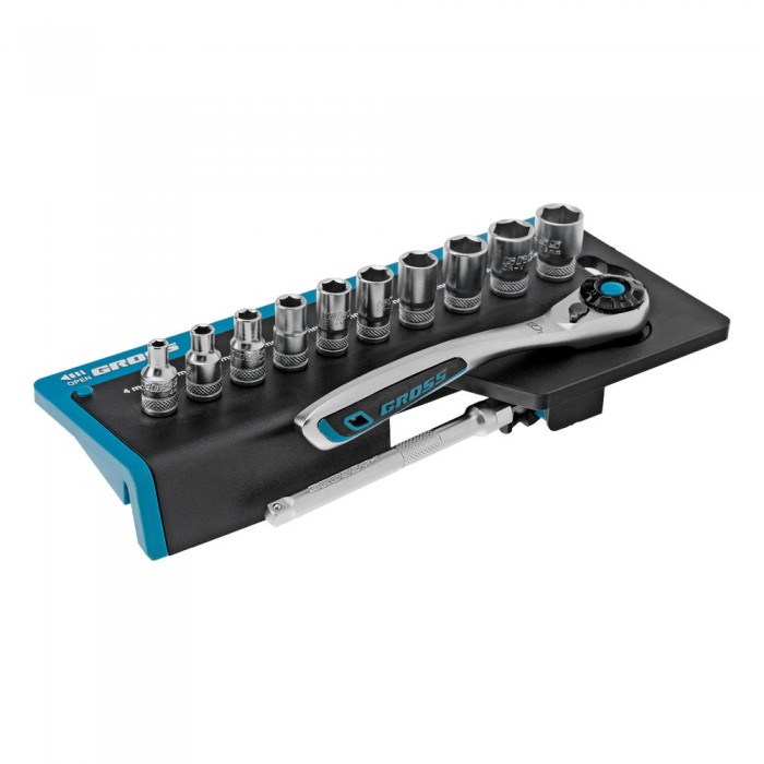 Набор торцевых головок, трещотка 120 зубьев, 1/4", CrV, 12 предметов Gross
