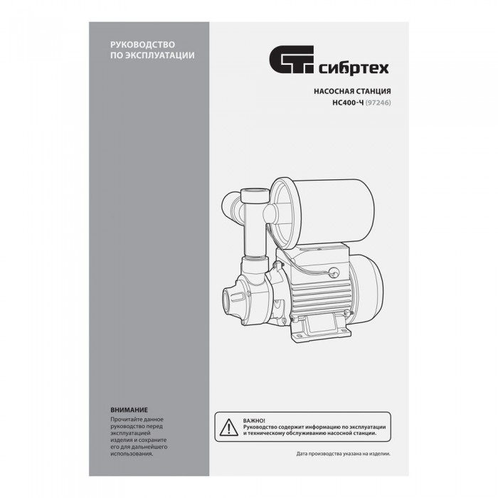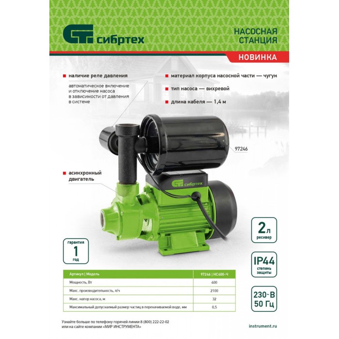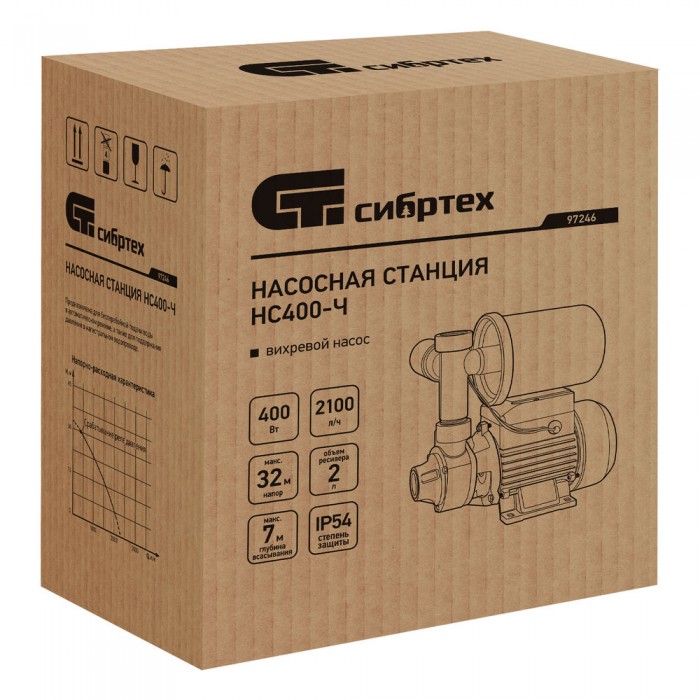 Насосная станция НС400-Ч, 400 Вт, напор 32 м, 2100 л/ч, ресивер 2 л Сибртех (97246)