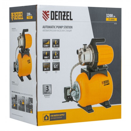 Насосная станция PS800X, 800 Вт, 3200 л/ч, ресивер 24 л, подъем 38 м, нержавейка Denzel (97210)