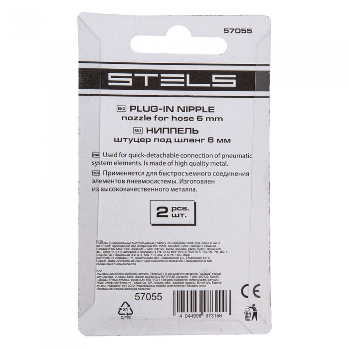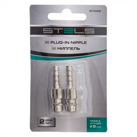 Ниппель универсальный быстросъемный ("папа") 1/4, со штуцером "елка" под шланг 6 мм, 2 шт, Stels (57055)