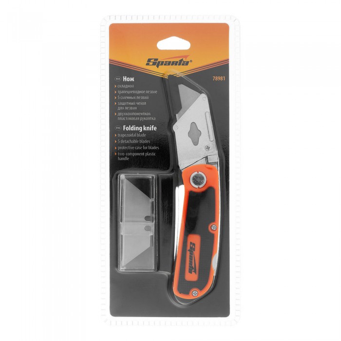 Нож, 19 мм, складной, пластиковая двухкомпонентная рукоятка, сменное трапециевидное лезвие, 5 лезвий Sparta (78981)