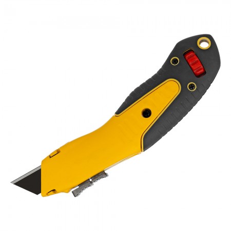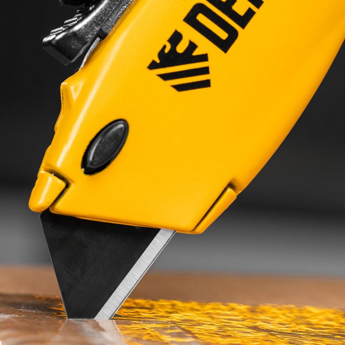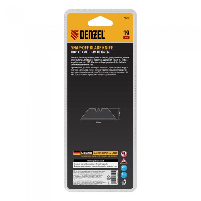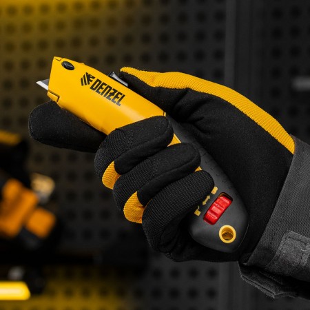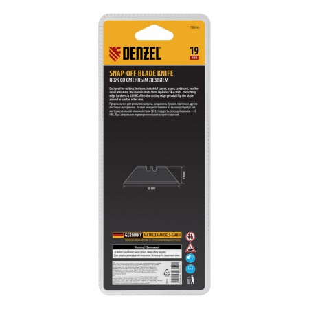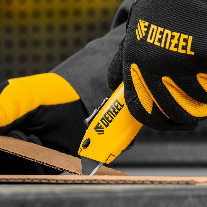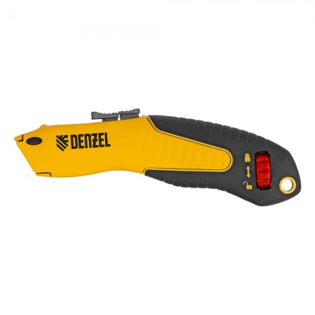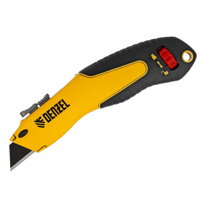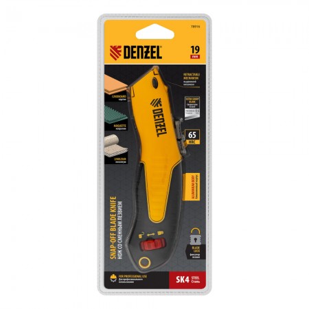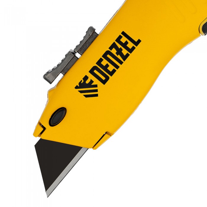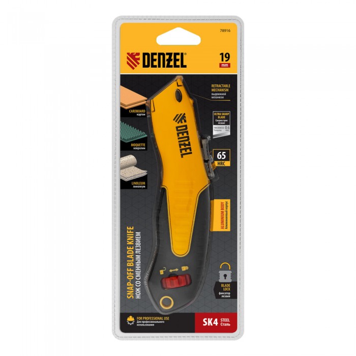 Нож, 19мм, сменное трапециевидное  лезвие, SK4, алюминиевый корпус, торцевой зажим Denzel (78916)