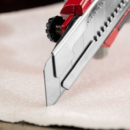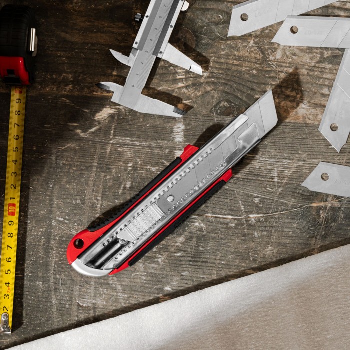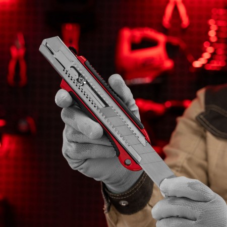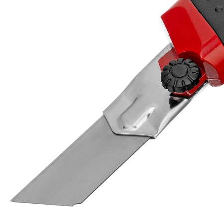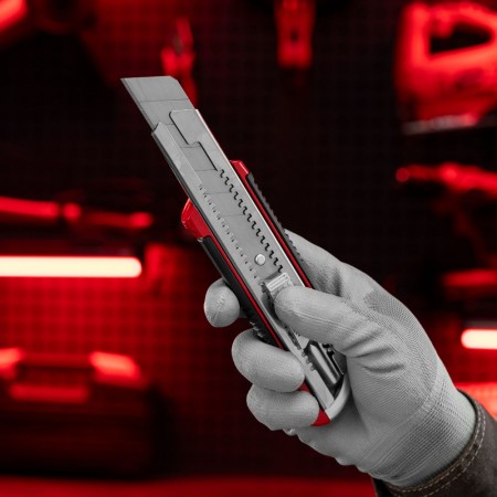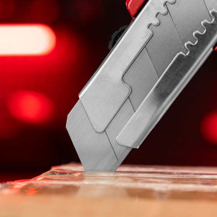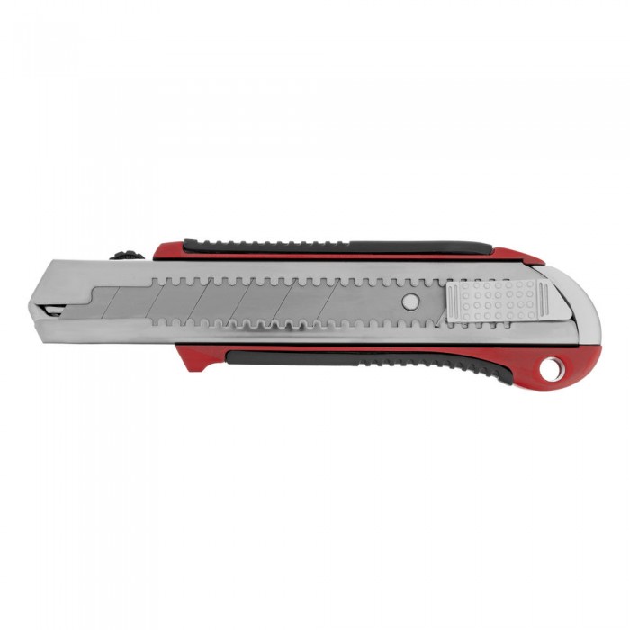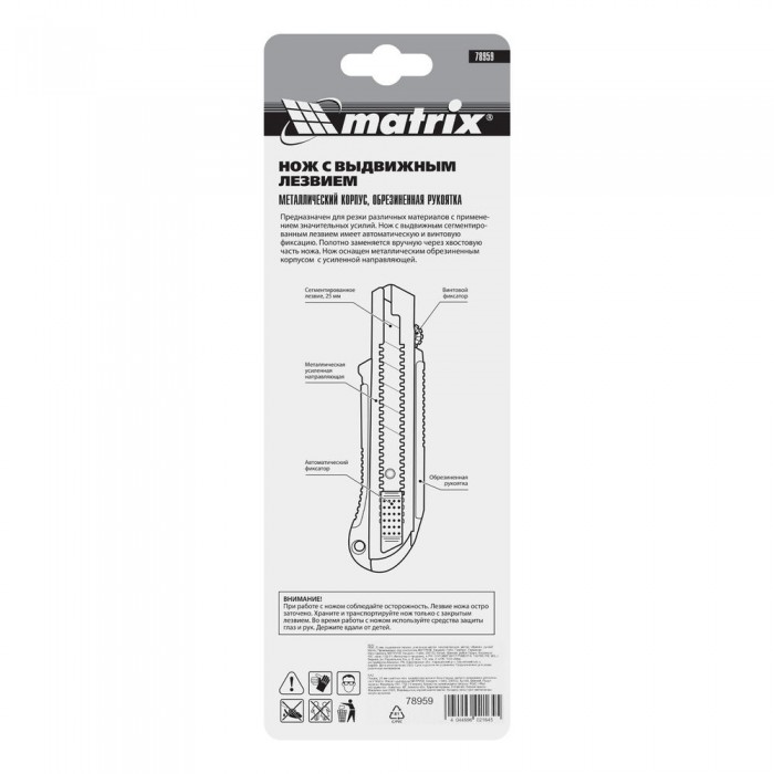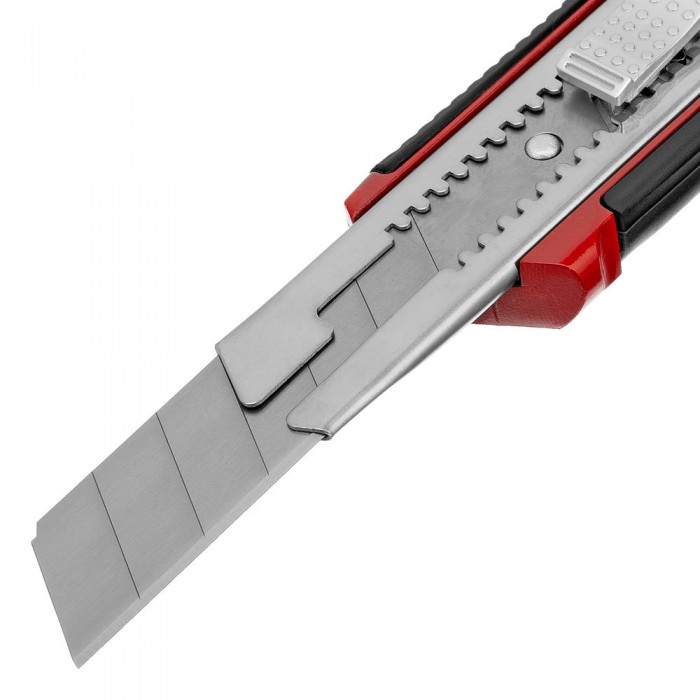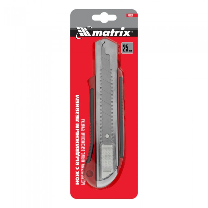 Нож, 25 мм, выдвижное лезвие, усиленная металлическая направляющая, металлическая обрезиненная рукоятка Matrix (78959)