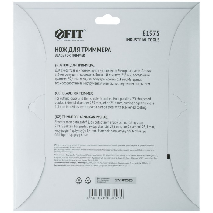 Для скоса травы и тонких веток кустарников. Четыре лопасти. Лезвия с двумя режущими кромками. Посадочный диаметр 25,4 мм. Материал: инструментальная сталь с черненым покрытием. Упаковка: картонный конверт.