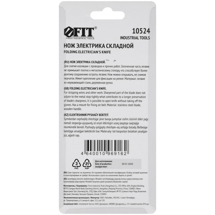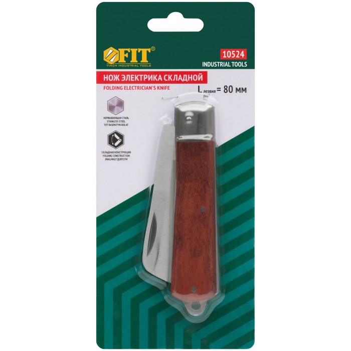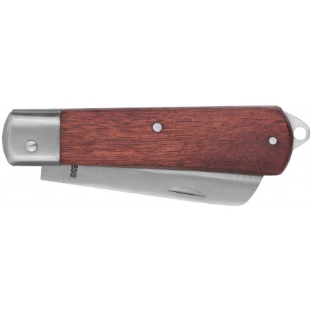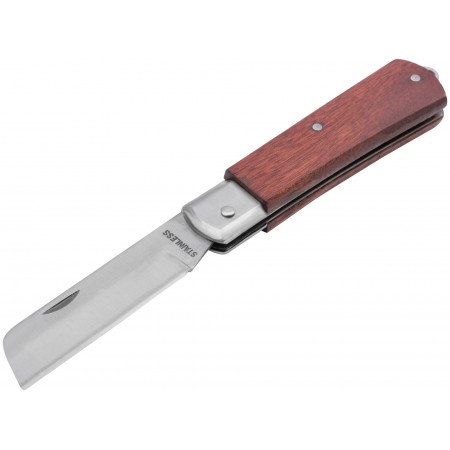 Складной. Для зачистки изоляции с проводов, мелкого ремонта. Заточенная чать лезвия не примыкает плотно к металическому стопору, что способствует дольшему сохранению остроты лезвия. Нож можно открывать, не снимая перчаток. Имеет крепление для фиксации ножа на ремне. Материал: лезвие из нержавеющей стали, деревянная ручка. Упаковка: блистер.