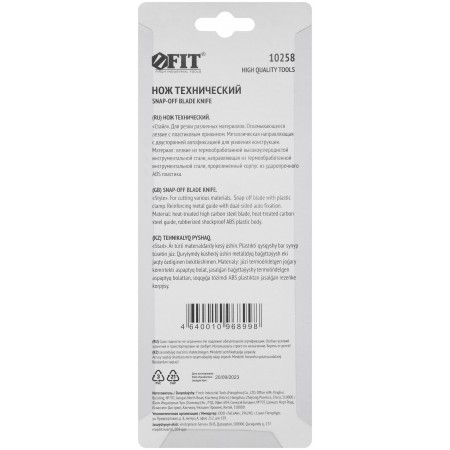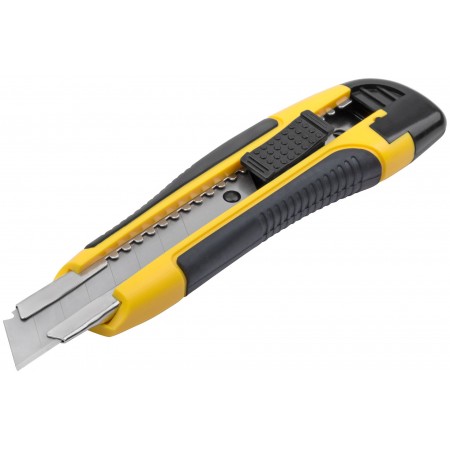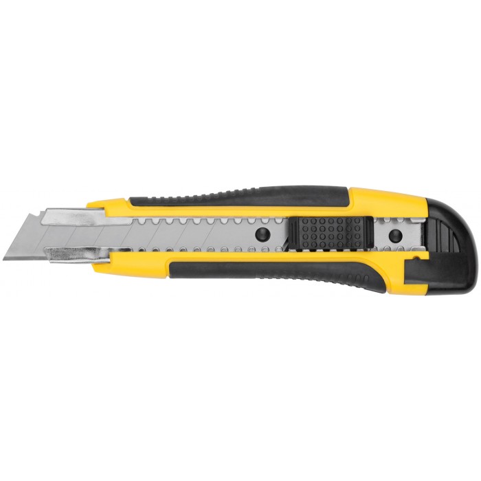 «Стайл». «Отламывающееся» лезвие с пластиковым прижимом. Материал: прорезиненный корпус из ударопрочного ABS пластика, с металлической направляющей с двусторонней автофиксацией, лезвие из высокоуглеродистой стали, прорезиненная вставка на рукоятке. Упаковка: блистер.