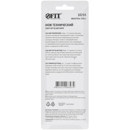«Отламывающиеся лезвие», 15 сегментов, с пластиковым прижимом. Материал: пластиковый корпус с резиновыми вставками, усиленный металлической направляющей, лезвие из высокоуглеродистой стали. Упаковка: блистер.
