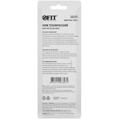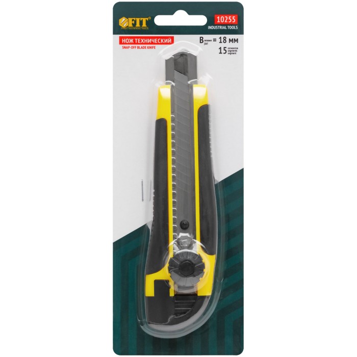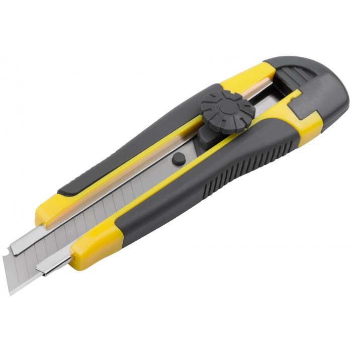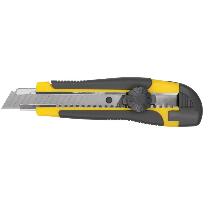 «Отламывающееся» лезвие 18 мм, 15 сегментов. PP Пластиковый прорезиненный корпус, металлическая направляющая. Лезвие из высокоулеродистой стали SK-5. Вращающийся пластиковый прижим.