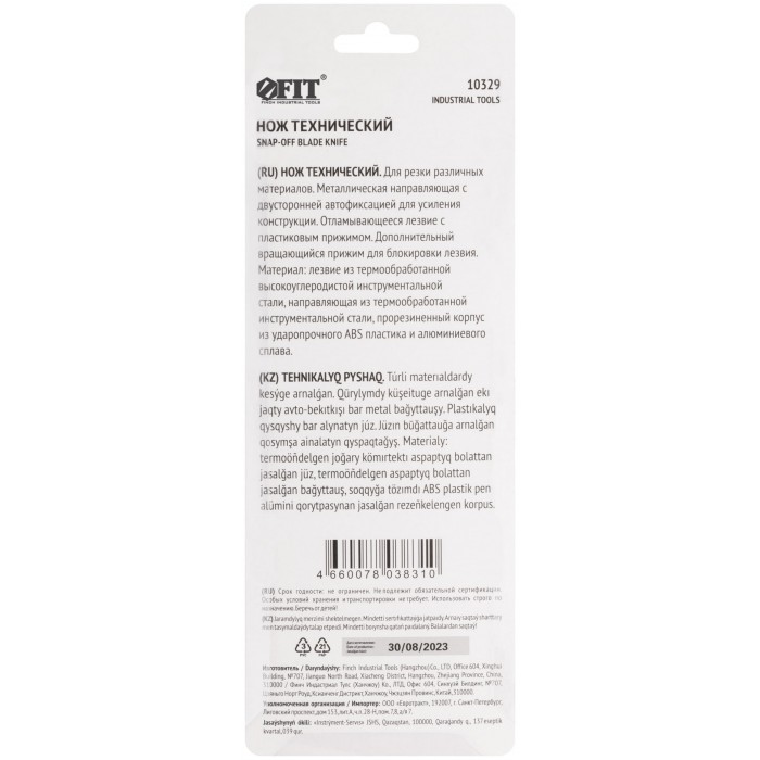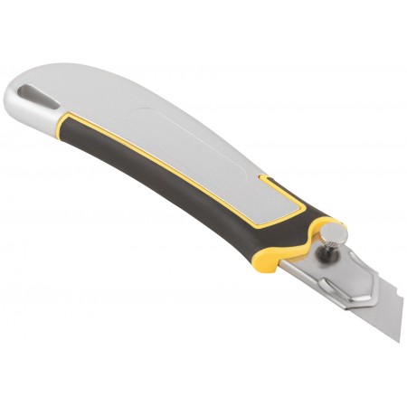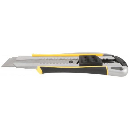 «Отламывающееся» лезвие с пластиковым прижимом. Дополнительный вращающийся прижим для блокировки лезвия. Металлическая направляющая с двусторонней автофиксацией для усиления конструкции. Материал: прорезиненный корпус из алюминиевого сплава с ударопрочными вставками из ABS пластика, лезвие из высокоуглеродистой стали. Упаковка: блистер.