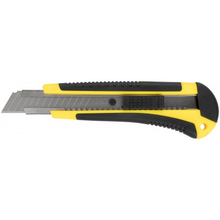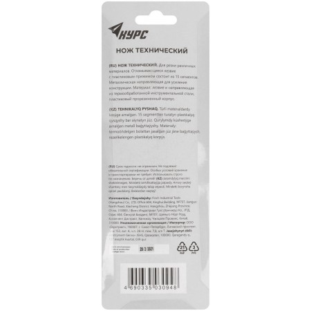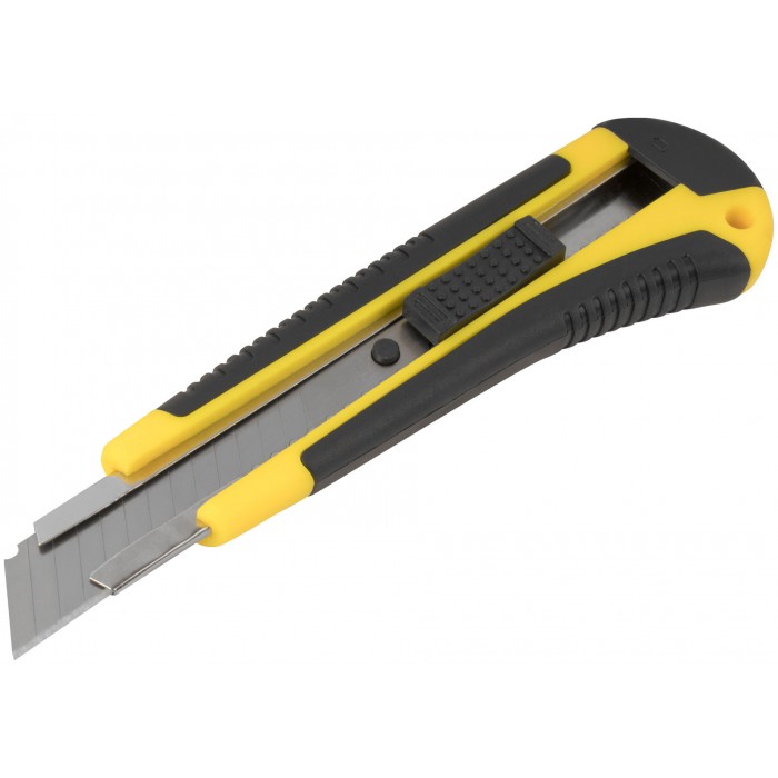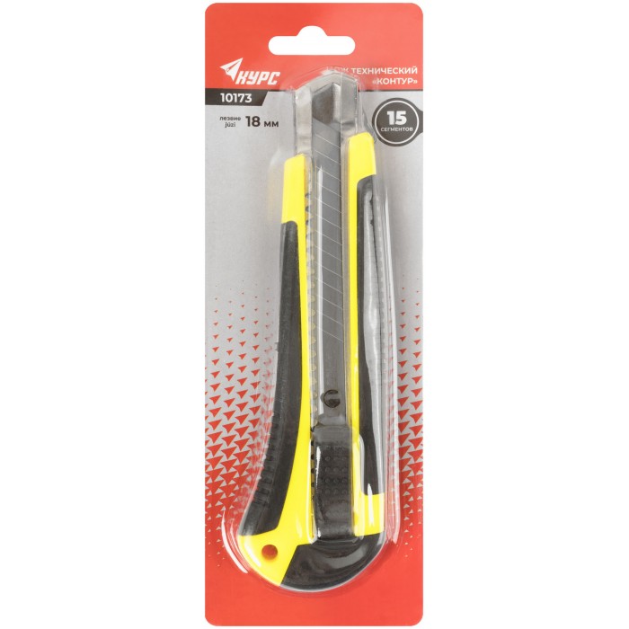 «Контур». «Отламывающееся» лезвие с пластиковым прижимом состоит из 15 сегментов. Пластиковый прорезиненный корпус, усиленный металлической направляющей. Упаковка: блистер.