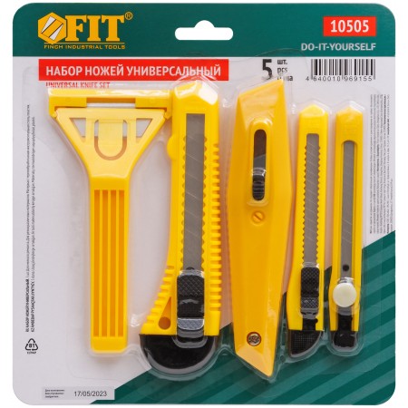 Набор многофункциональный. Для мелкого ремонта. В наборе: скребок стекольный, нож технический (b = 18 мм), нож для ленолиума с трапецивидным лезвием, пластмассовый корпус, нож технический (b = 9 мм) – 2 штуки. Материал: инструментальная сталь, пластик. Упаковка: блистер.