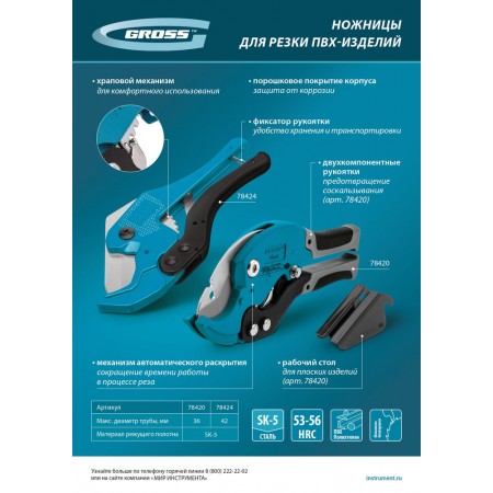 Ножницы для резки изделий из ПВХ, D до 36 мм, двухкомпонентные рукоятки, рабочий стол для плоских изделий Gross (78420)