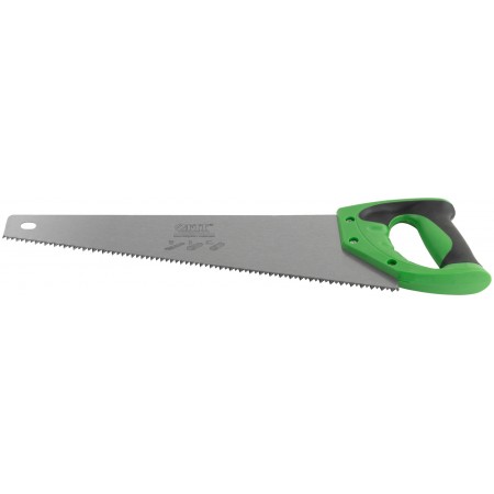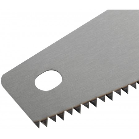 Крупный зуб (5 TPI). Зубья с двугранной заточкой и высокочастотной закалкой. Материал: высокоуглеродистая сталь, прорезиненная ударопрочная ручка.