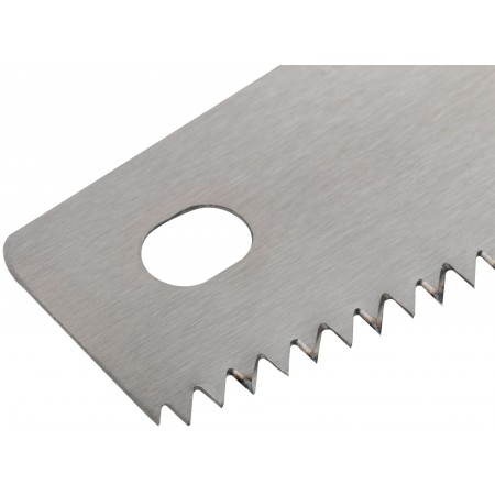 Крупный зуб (5 TPI). С закалкой и двугранной заточкой. Для распиловки крупных досок и бревен. Материал: высокоуглеродистая инструментальная сталь, пластиковая прорезиненная ручка.