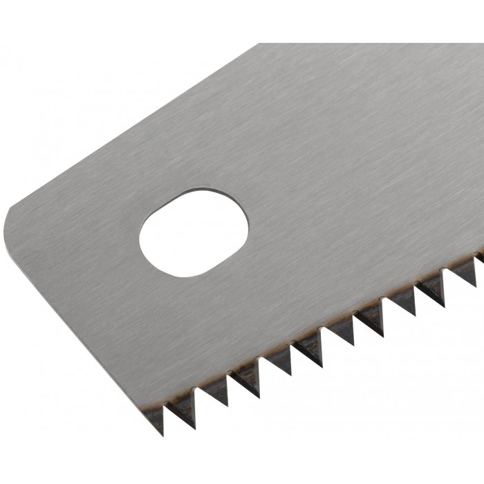 Крупный зуб (5 TPI). Зубья с двугранной заточкой и высокочастотной закалкой. Материал: высокоуглеродистая сталь, прорезиненная ударопрочная ручка.