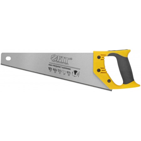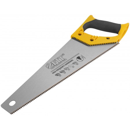 Профи. Для тонкого пиления, мелкий зуб (11 зубьев на дюйм). С 3-х гранной заточкой и высокочастотной закалкой зубьев. Для ламината, паркетной доски, фанеры. Материал: высокоуглеродистая инструментальная сталь, пластиковая ручка с прорезиненной вставкой.