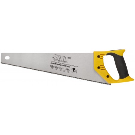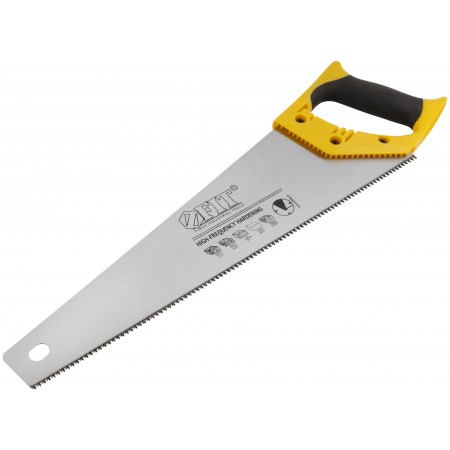 Профи. Для тонкого пиления, мелкий зуб (11 зубьев на дюйм). С 3-х гранной заточкой и высокочастотной закалкой зубьев. Для ламината, паркетной доски, фанеры. Материал: высокоуглеродистая инструментальная сталь, пластиковая ручка с прорезиненной вставкой.