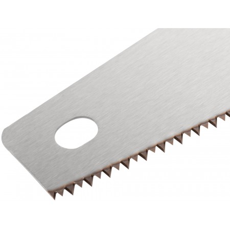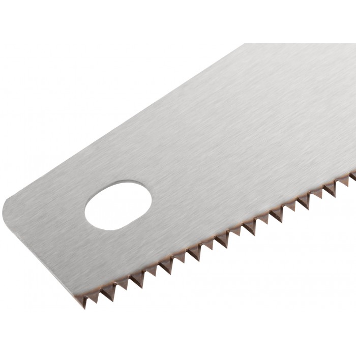 Средний зуб (7 зубьев на дюйм). Зубья с 2-х гранной заточкой и высокочастотной закалкой. Материал: высокоуглеродистая сталь, пластиковая ручка с прорезиненной вставкой.
