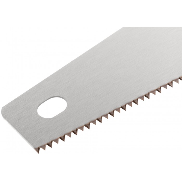 Средний зуб (7 зубьев на дюйм). Зубья с 2-х гранной заточкой и высокочастотной закалкой. Материал: высокоуглеродистая сталь, пластиковая ручка с прорезиненной вставкой.