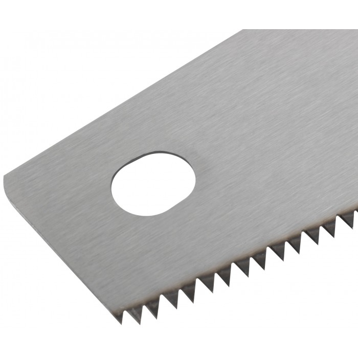 Средний зуб (7 TPI). Для работы с мягкими и твердыми породами древесины, фанерой, ДСП. Зубья с двугранной заточкой, разведены, имеют высокочастотную закалку. Материал: высокоуглеродистая сталь, пластиковая ручка с прорезиненной вставкой.