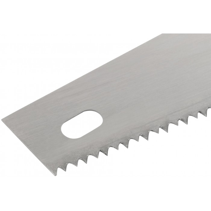 Универсальная. Крупный зуб (шаг 4,5 мм). Зубья разведены и заточены. Полотно с защитной планкой для зубьев. Материал: высокоуглеродистая закаленная сталь, двухкомпонентная ручка.