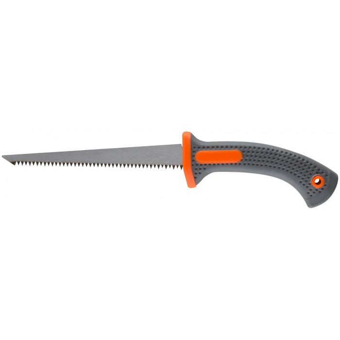 Для работы по гипсокартону. Двухсторонняя заточка зубьев, возможность выпиливать как прямые линии, так и линии произвольной формы. Двухкомпонентная прорезиненная ручка, лезвие из высококачественной инструментальной стали.