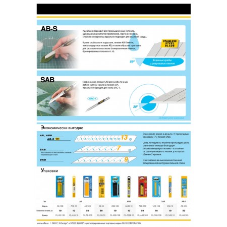 Используются в качестве сменных рабочих элементов в ножах OLFA SAC-1. Применяются для резки картона, бумаги, гибкой пластмассы, пленки, обоев.