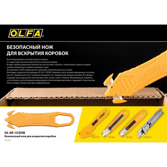 OLFA SK-15/DSB— это удобный и безопасный нож для разрезания упаковки. Благодаря продуманной конструкции открытая часть лезвия из нержавеющей стали минимальна, что предотвращает контакт режущего элемента с пальцами или предметами внутри коробки. Для еще большей безопасности вверху инструмента расположен разрезатель скотча.