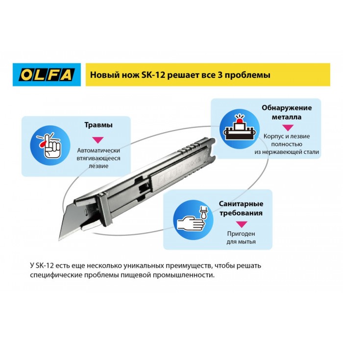 Используются в качестве сменных рабочих элементов в ножах OLFA SK-12, SK-4, UTC-1. Применяются в пищевой промышленности, на складах, в магазинах, на производствах для разрезания пищевой пленки, картона, фольги, скотча.