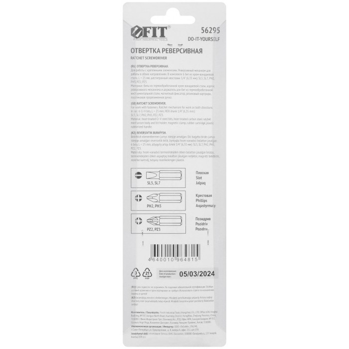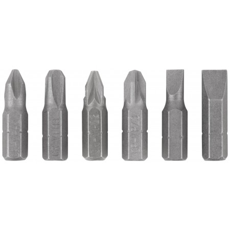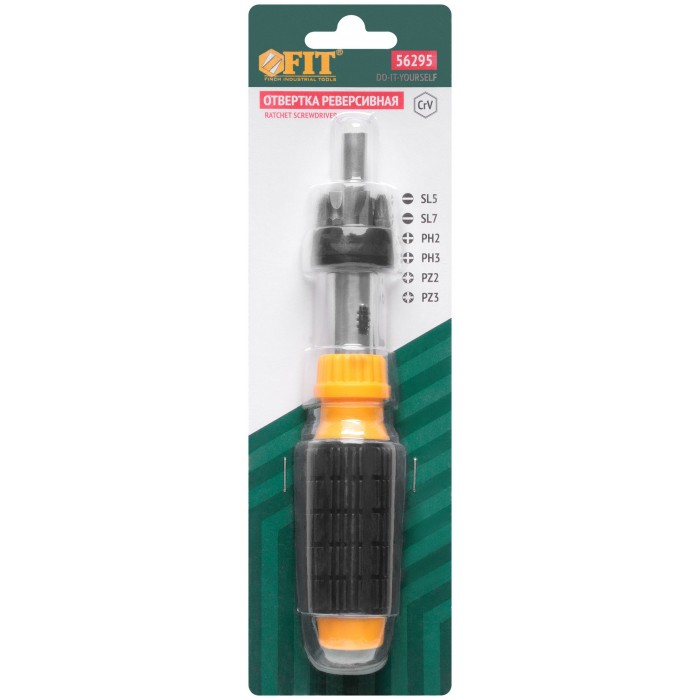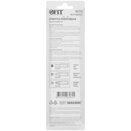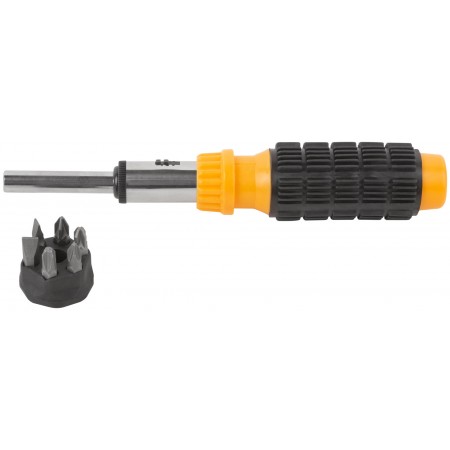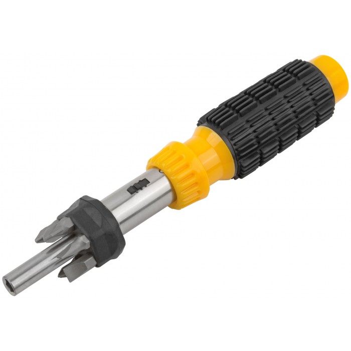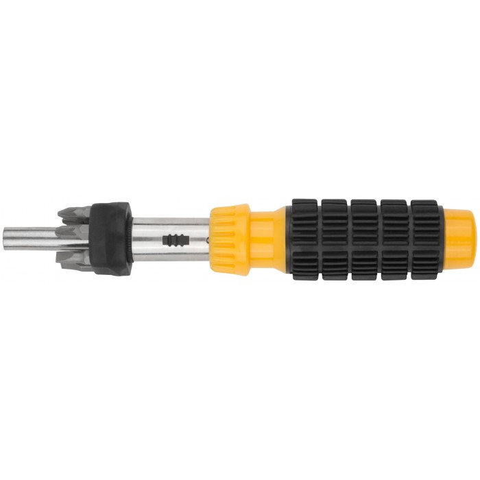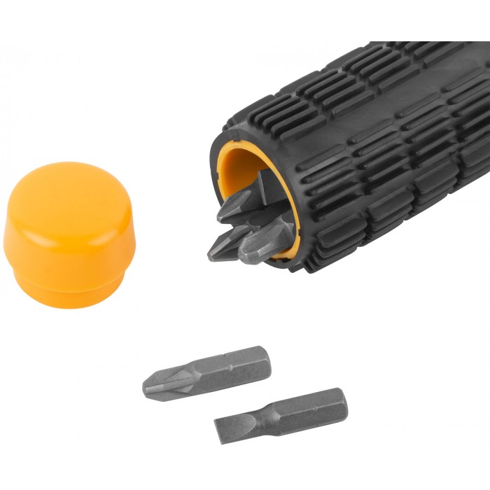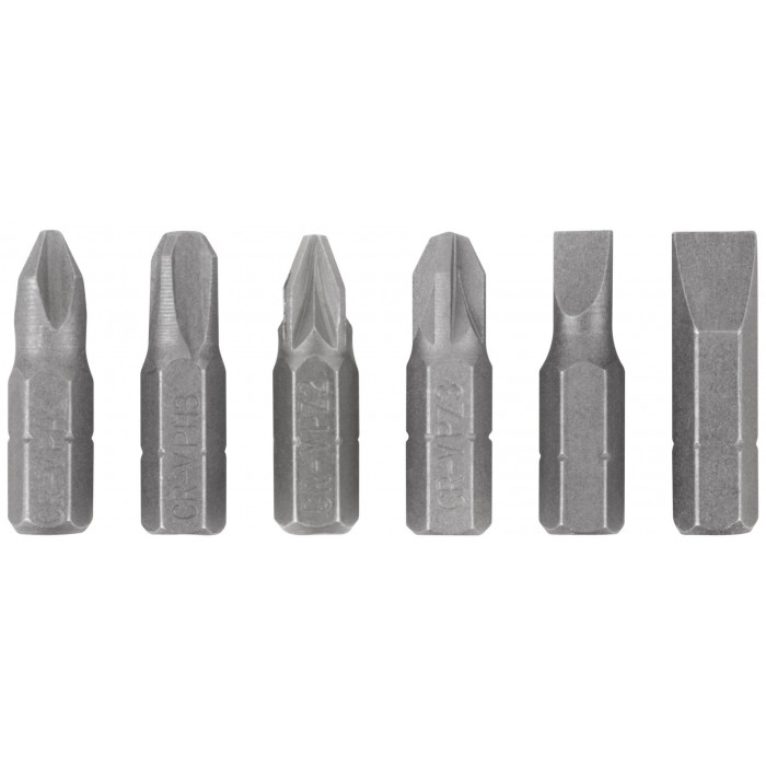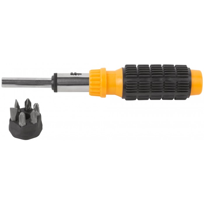 «Эконом». C магнитным фиксатором бит и резиновым картриджем для хранения бит. Пластиковая прорезиненная ручка с отсеком для хранения бит. В наборе: 6 бит из хром-ванадиевой стали (SL5; SL7; PH2; PH3; PZ2; PZ3).