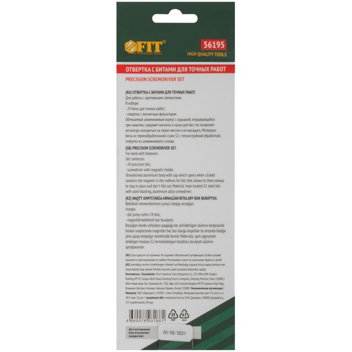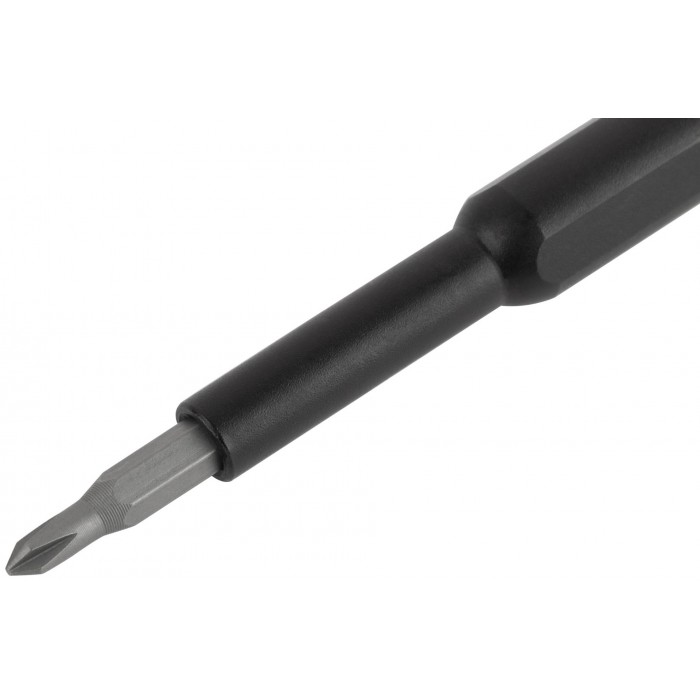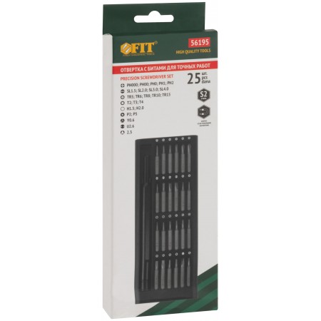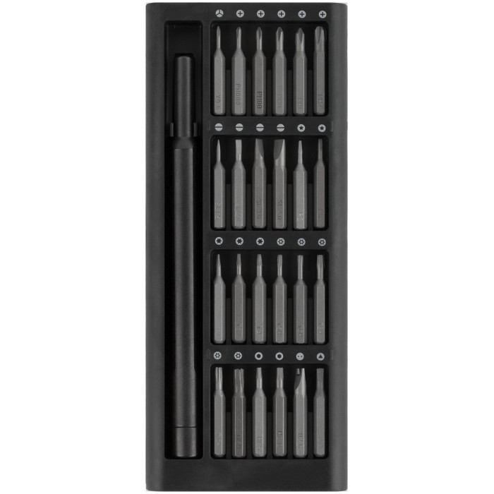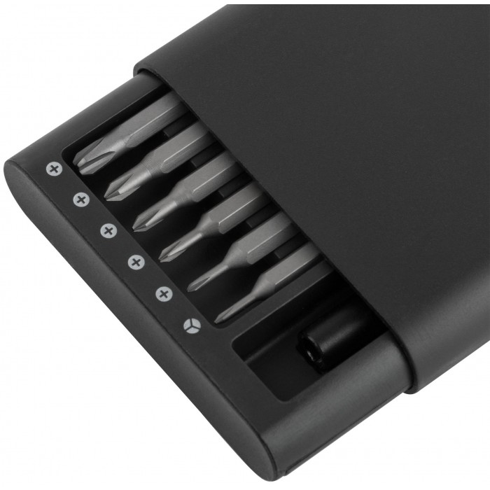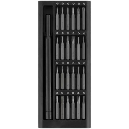Профи. Для точных работ. Отвертка для бит с магнитным фиксатором, биты 24 шт: SL1.5, SL2.0, SL3.0, SL4.0; PH000, PH00, PH0, PH1, PH2; H1.5, H2.0; Y-тип Y0.6; Pentalobe P2, P5; T2, T3, T4; Torx с отверстием TR5, TR6, TR8, TR10, TR15; Triangle 2,3; U-тип U 2.6. Обтекаемый алюминиевый кейс с крышкой содержит магниты в пазах для бит, что позволяет им всегда находиться на своих местах и не выпадать. Материал: биты из термообработанной стали S2 с пескоструйной обработкой, отвертка из алюминиевого сплава. Упаковка: алюминиевый кейс в картонной коробке.