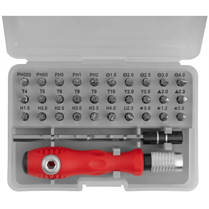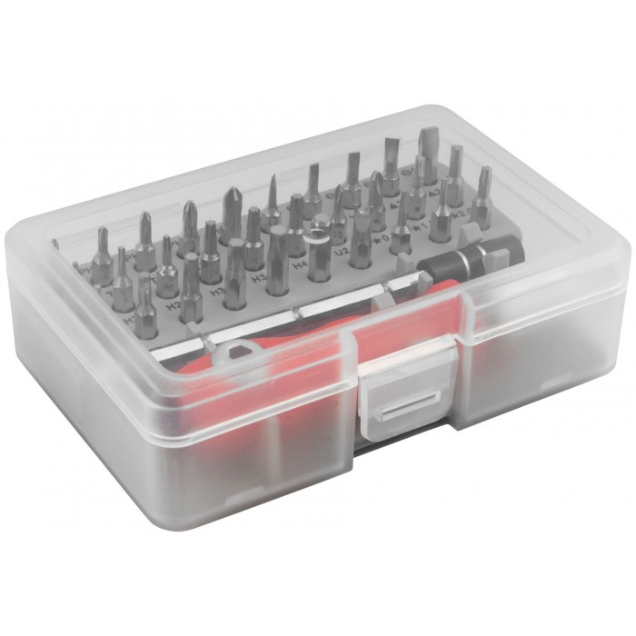 Биты 30 шт. PH000, PH00, PH0, PH1, PH2; SL1.5, SL2.0, SL2.5, SL3.0, SL4.0; T4, T5, T6, T8, T9, T10; Y-тип: Y2.0, Y3.0; треугольник 2.0, 2.3; H1.5, H2.0, H2.5, H3.0, H3.5, H4.0; U-тип: U2.3; пятилучевой Torx: 0.8, 1.2, 2.0; пластиковая ручка с металлическим фиксатором, удлинитель с магнитным фиксатором (L = 100 мм).