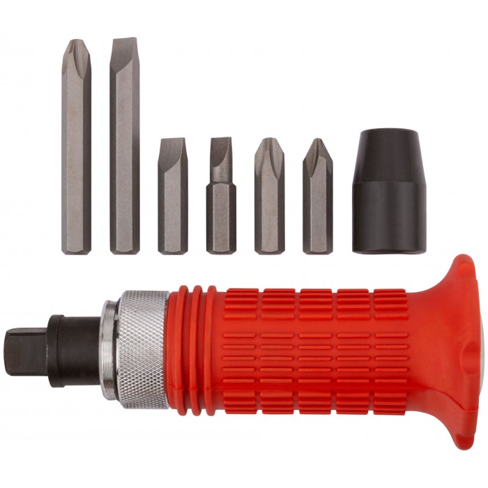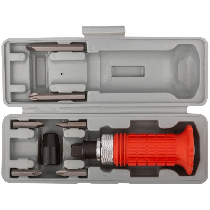 Отвертка ударная с реверсивным механизмом. Корпус из инструментальной стали с резиновым фартуком для защиты рук. В наборе: 6 бит из хром-ванадиевой стали (36 мм: SL6; SL8; PH2; PH3; биты 75 мм: SL8; PH3) + адаптер для бит. Упаковка: пластиковый футляр.