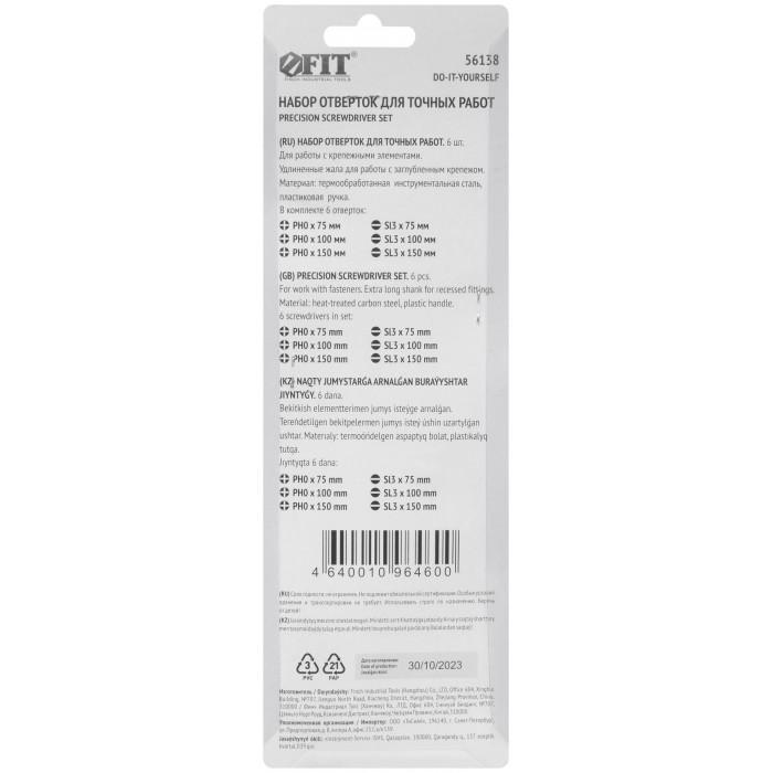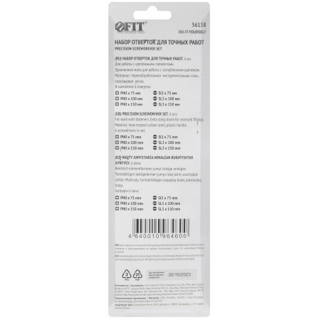 SL3 x 75 мм; SL3 x 100 мм; SL3 x 150 мм; PH0 x 75 мм; PH0 x 100 мм; PH0 x 150 мм. Материал: усиленная инструментальная сталь, пластиковая ручка. Упаковка: блистер