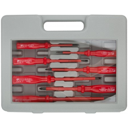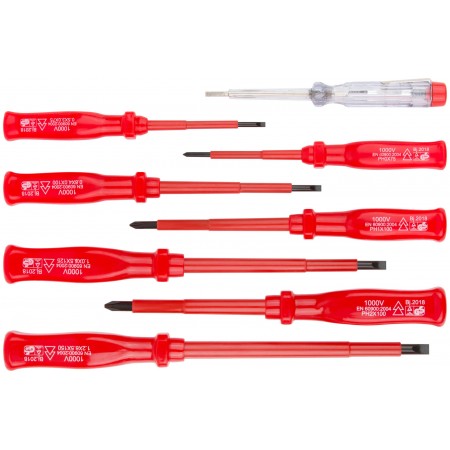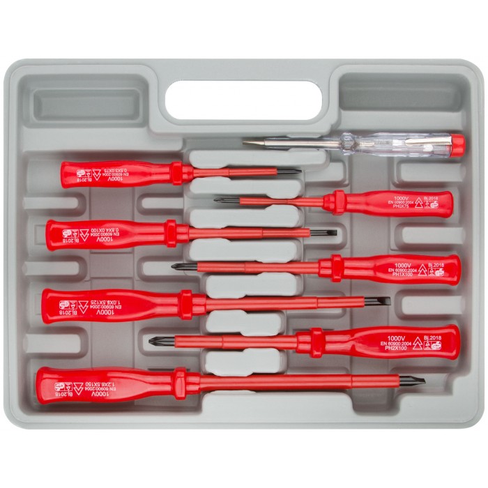 Набор 8 шт. 7 отверток 1000 В с изолированным жало из хром-ванадиевой стали, пластиковой ручкой (SL3 x 75; SL4 x 100; SL5,5 x 125; SL6,5 x 150; PH0 x 75; PH1 x 100; PH2 x 100) + отвертка индикаторная 100-250 V (SL3 x 140). Упаковка: пластиковый кейс