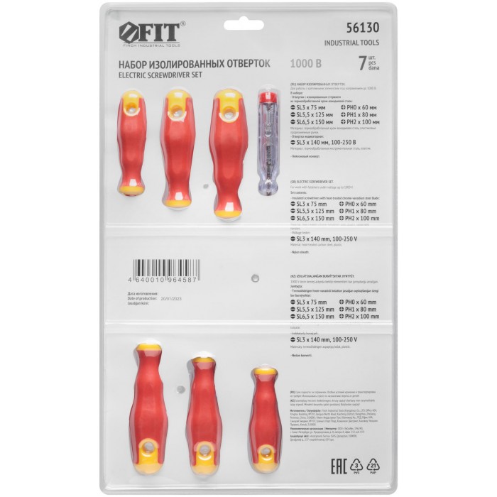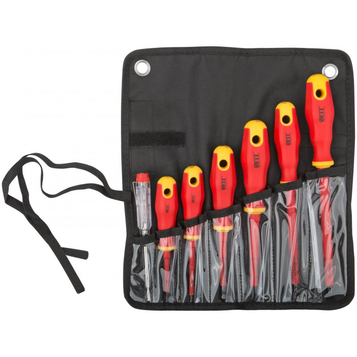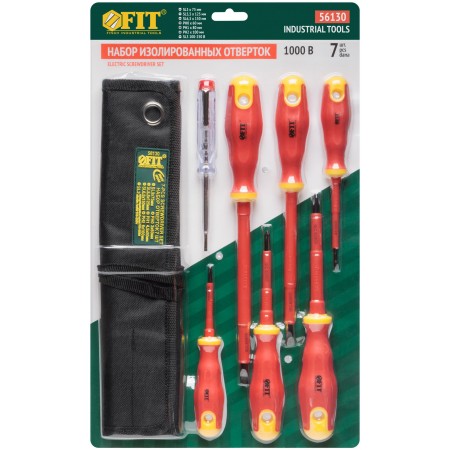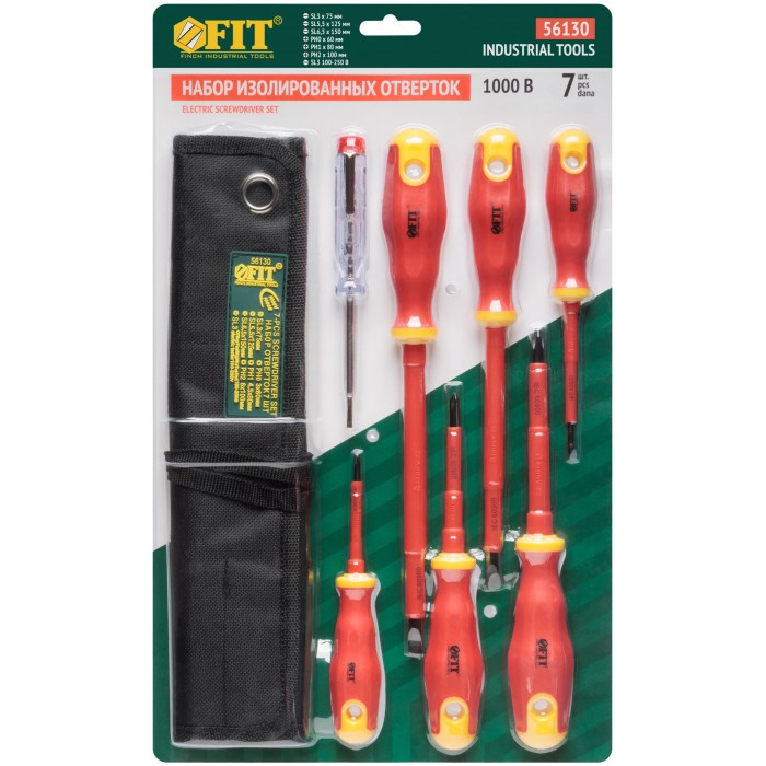 Набор 7 шт., в нейлоновом конверте: 6 отвёрток 1000 В с изолированным жалом из хром-ванадиевой стали, магнитным наконечником и прорезиненной ручкой (SL3x75; SL5.5x125; SL6.5x150; PH0 3x60; PH1 4.5x80; PH2 6.5x100), отвёртка индикаторная 100-250 V (SL3). Упаковка: блистер.