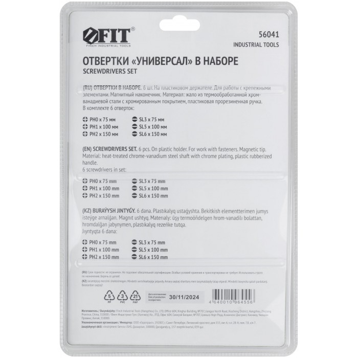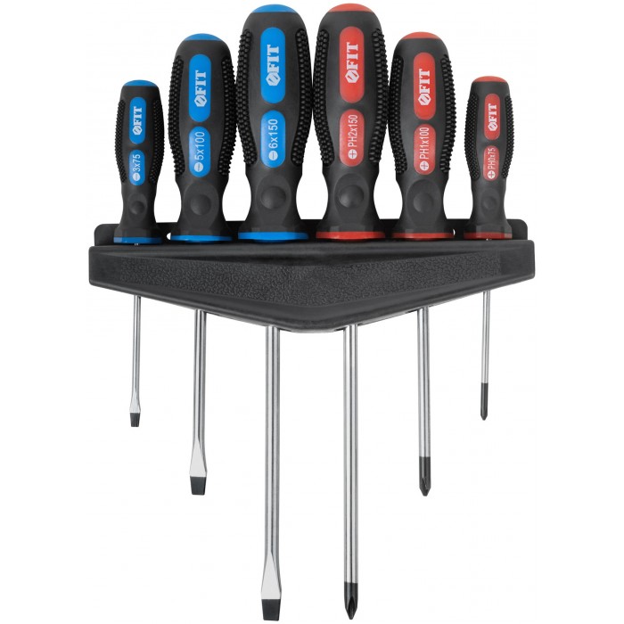 SL3 x 75 мм; SL5 x 100 мм; SL6 x 150 мм; PH0 x 75 мм; PH1 x 100 мм; PH2 x 150 мм. На пластиковом держателе. Материал: жало из хром-ванадиевой стали, магнитный наконечник, мягкая прорезиненная ручка. Упаковка: блистер.